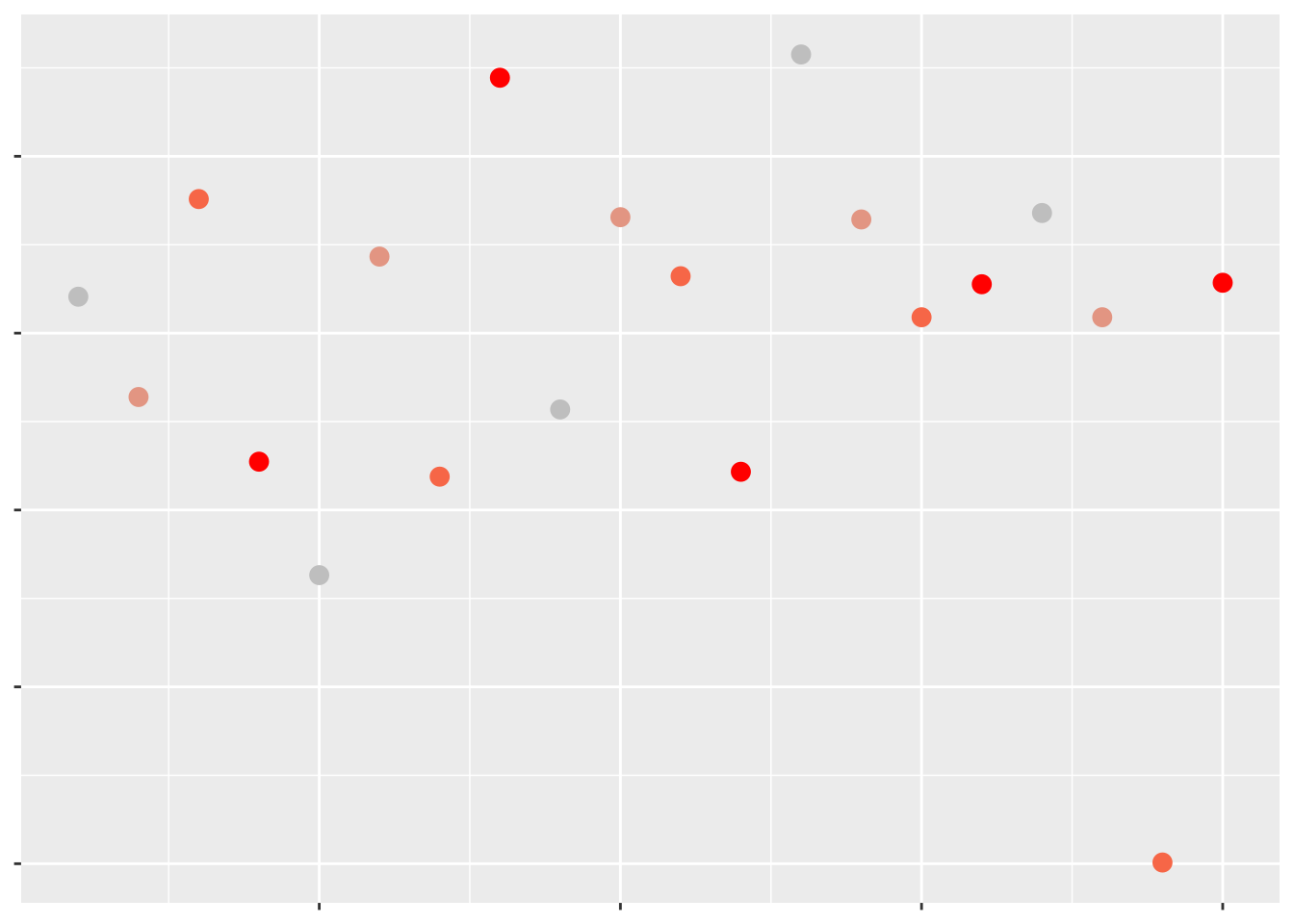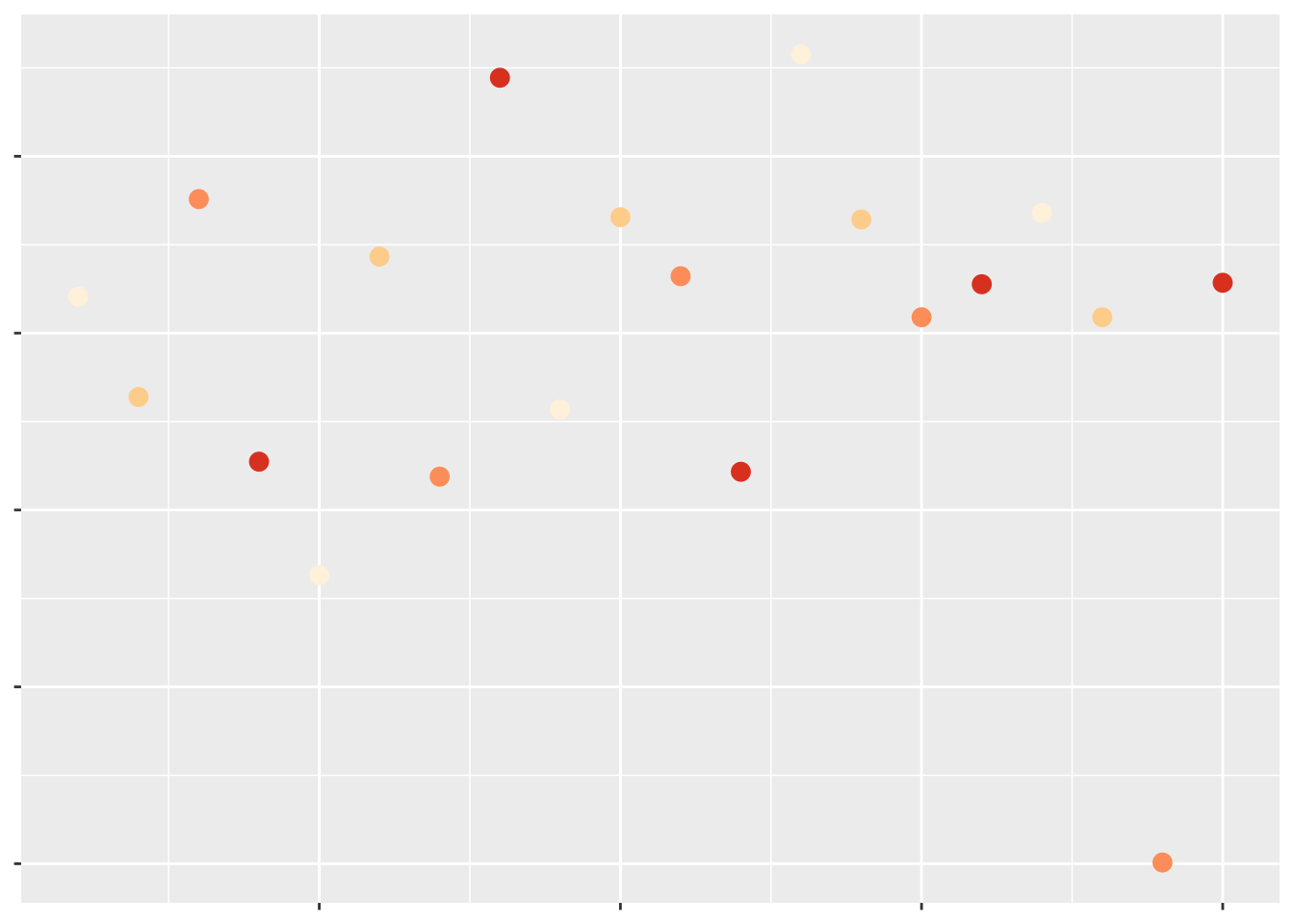 Try to compare Pontiac and Hyundai on the first graph, versus on this second one. If anything, removing our extraneous x aesthetic has made it easier to compare manufacturers. This is a big driver behind our second mantra – that everything should be made as simple as possible, but no simpler. Having extra aesthetics confuses a graph, making it harder to understand the story it’s trying to tell.