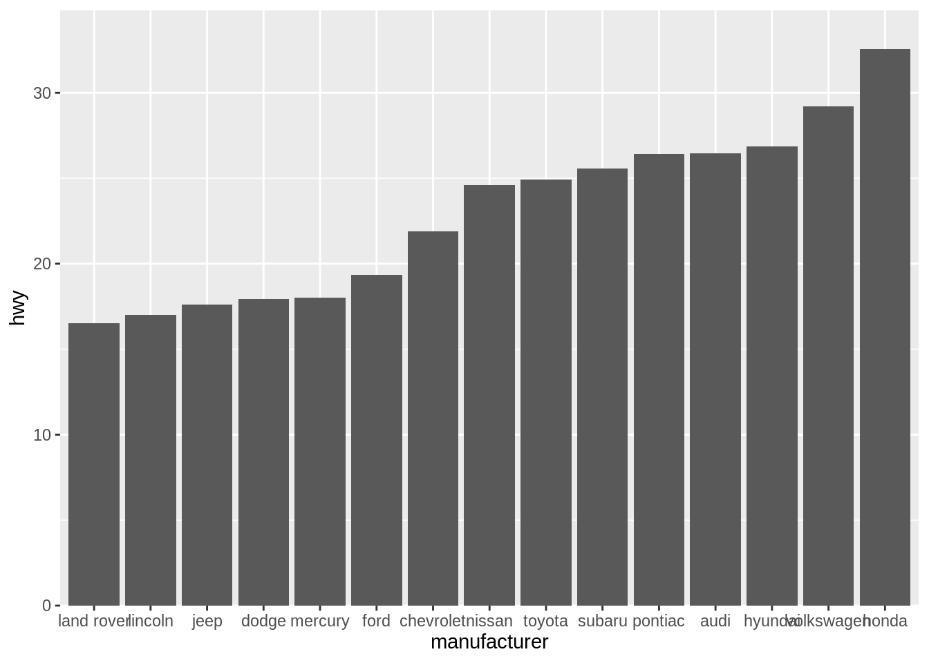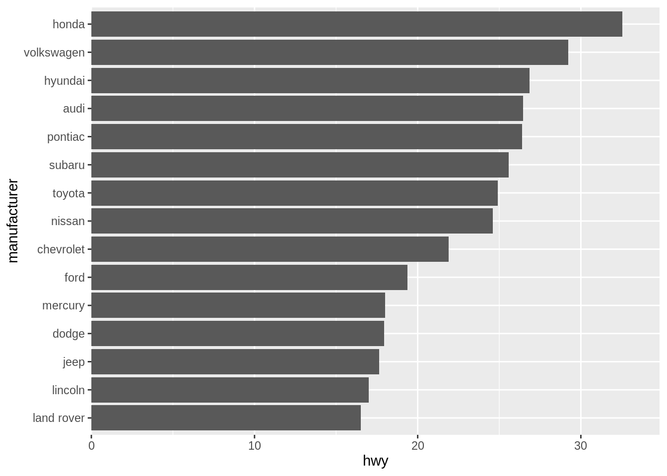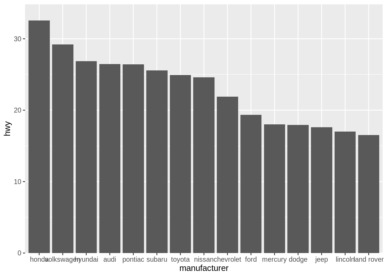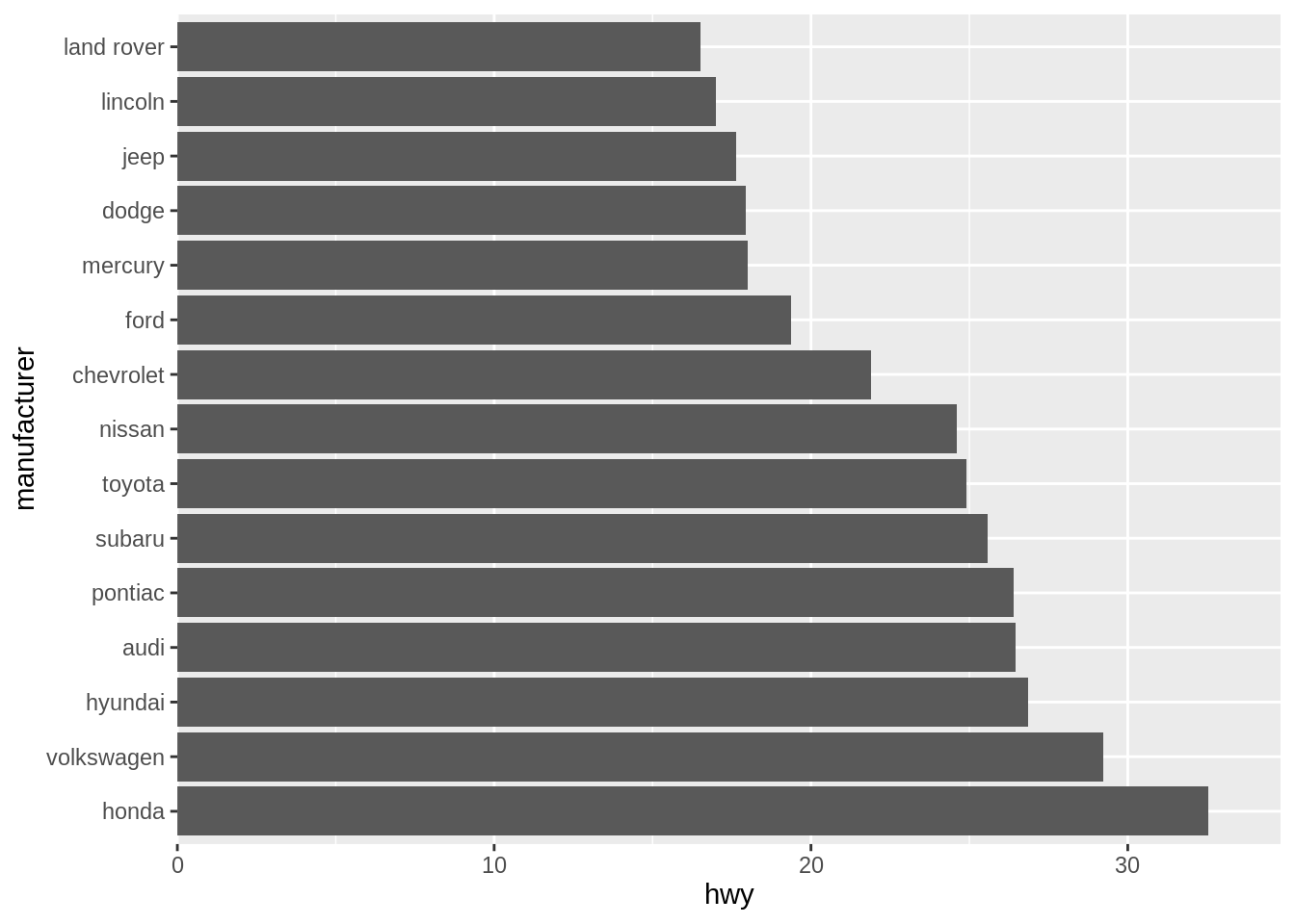 Applying this advice to categorical data can get a little tricky. Imagine that we’re looking at the average highway mileages for manufacturers of the cars in our data set: