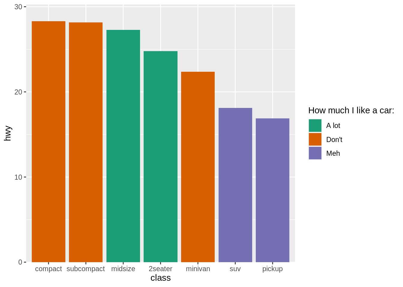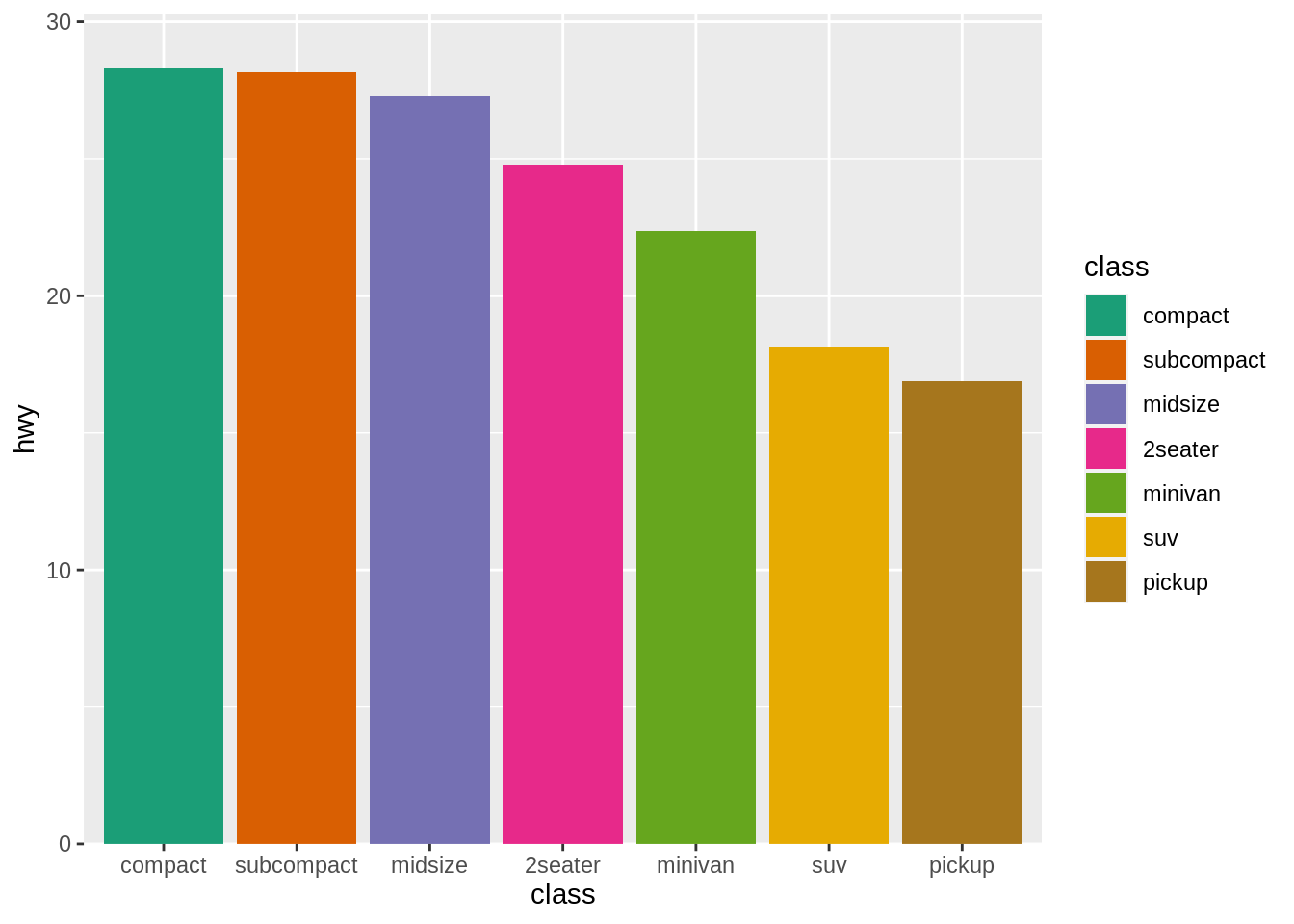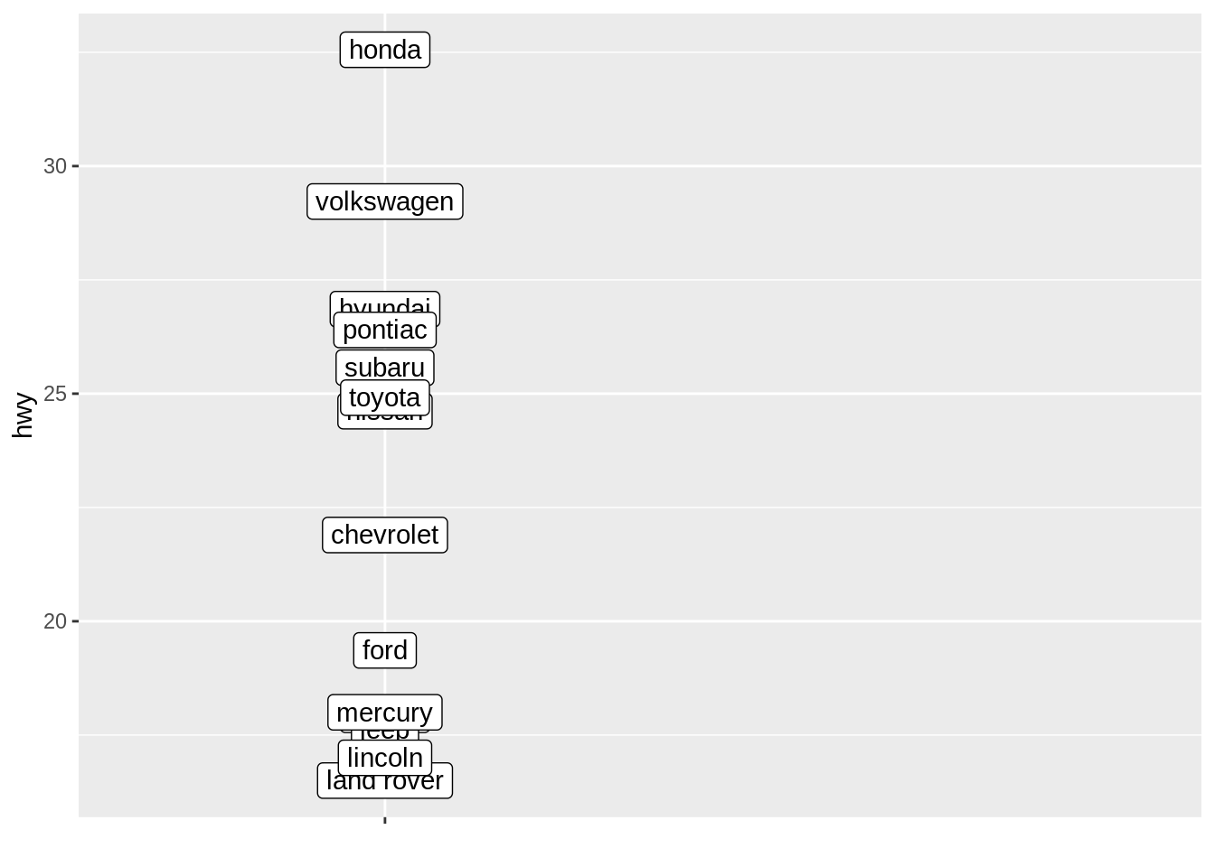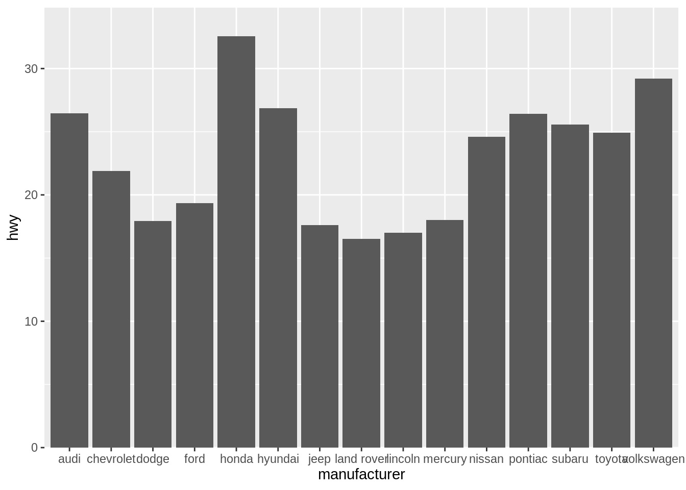 Applying this advice to categorical data can get a little tricky. Imagine that we’re looking at the average highway mileages for manufacturers of the cars in our data set: