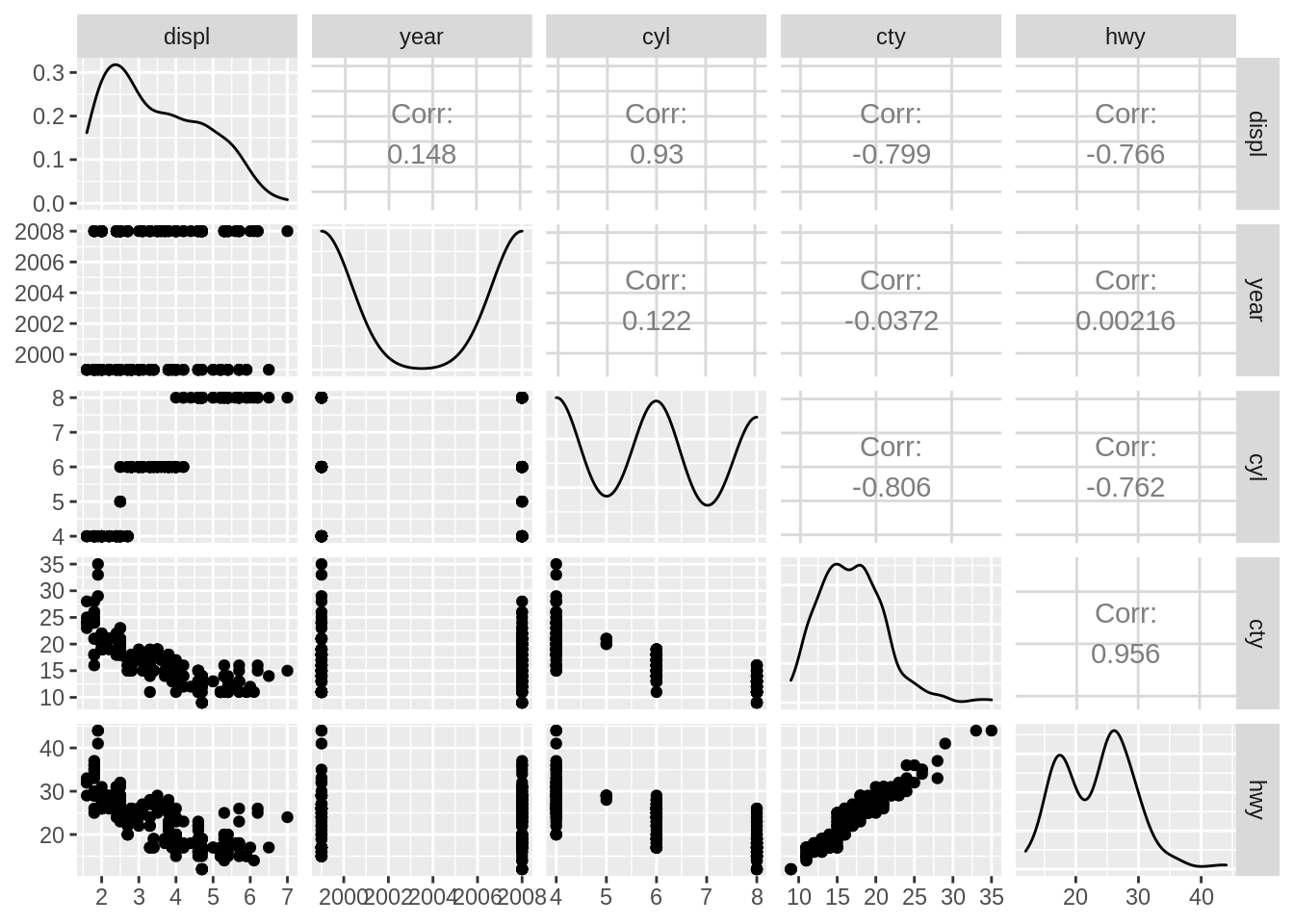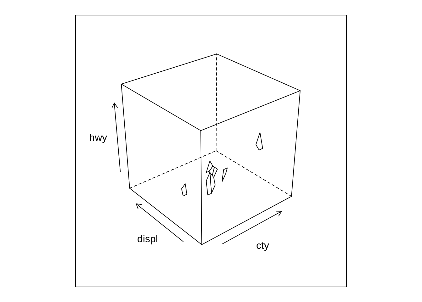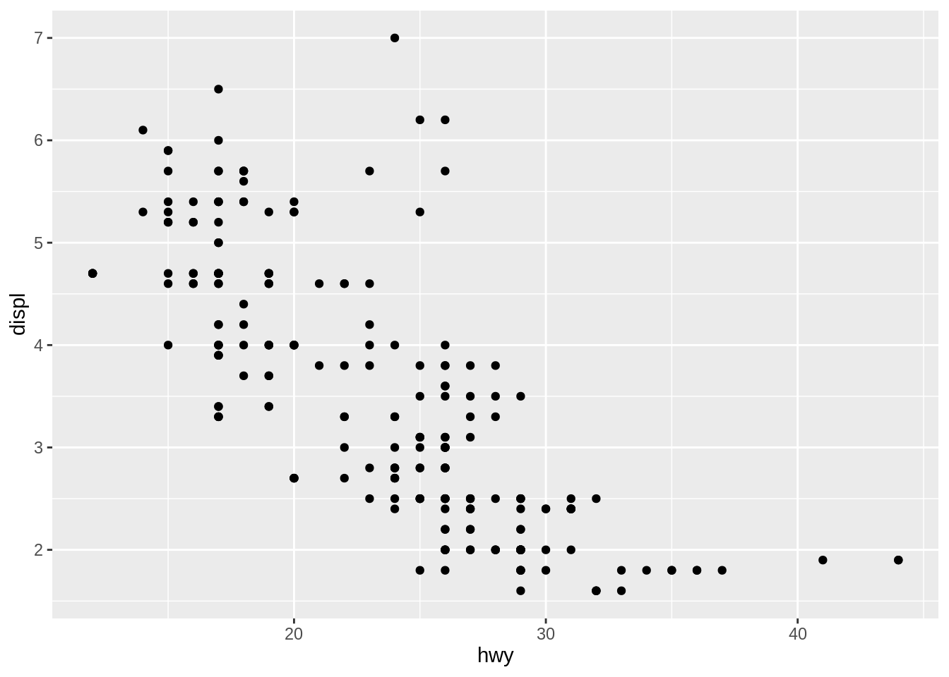 For what it’s worth, we’re using an EPA data set for this unit, representing fuel economy data from 1999 and 2008 for 38 popular models of car. “Hwy” is highway mileage, “displ” is engine displacement (so volume), and “cty” is city mileage. But frankly, our data set doesn’t matter right now - most of our discussion here is applicable to any data set you’ll pick up.