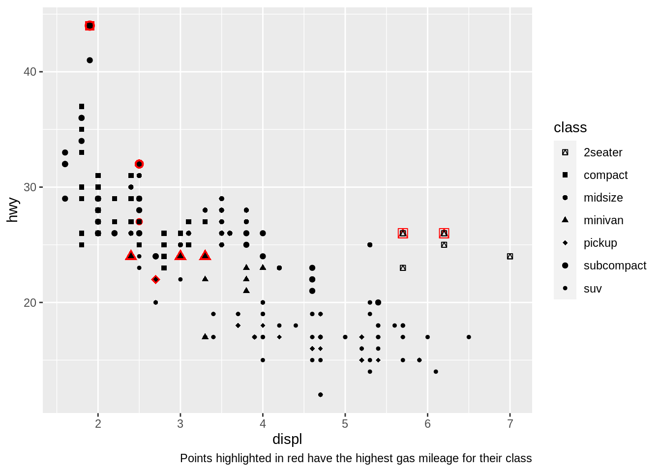 Doing so allows the viewer to quickly pick out the most important sections of our graph, increasing its effectiveness. Note that I used shape instead of color to separate the class of vehicles, by the way – combining point highlighting and using color to distinguish categorical variables can work, but can also get somewhat chaotic: