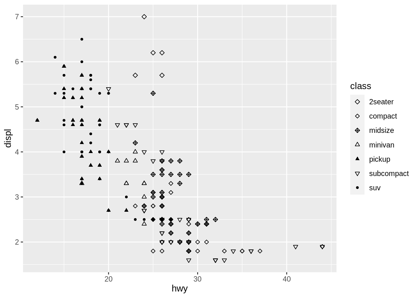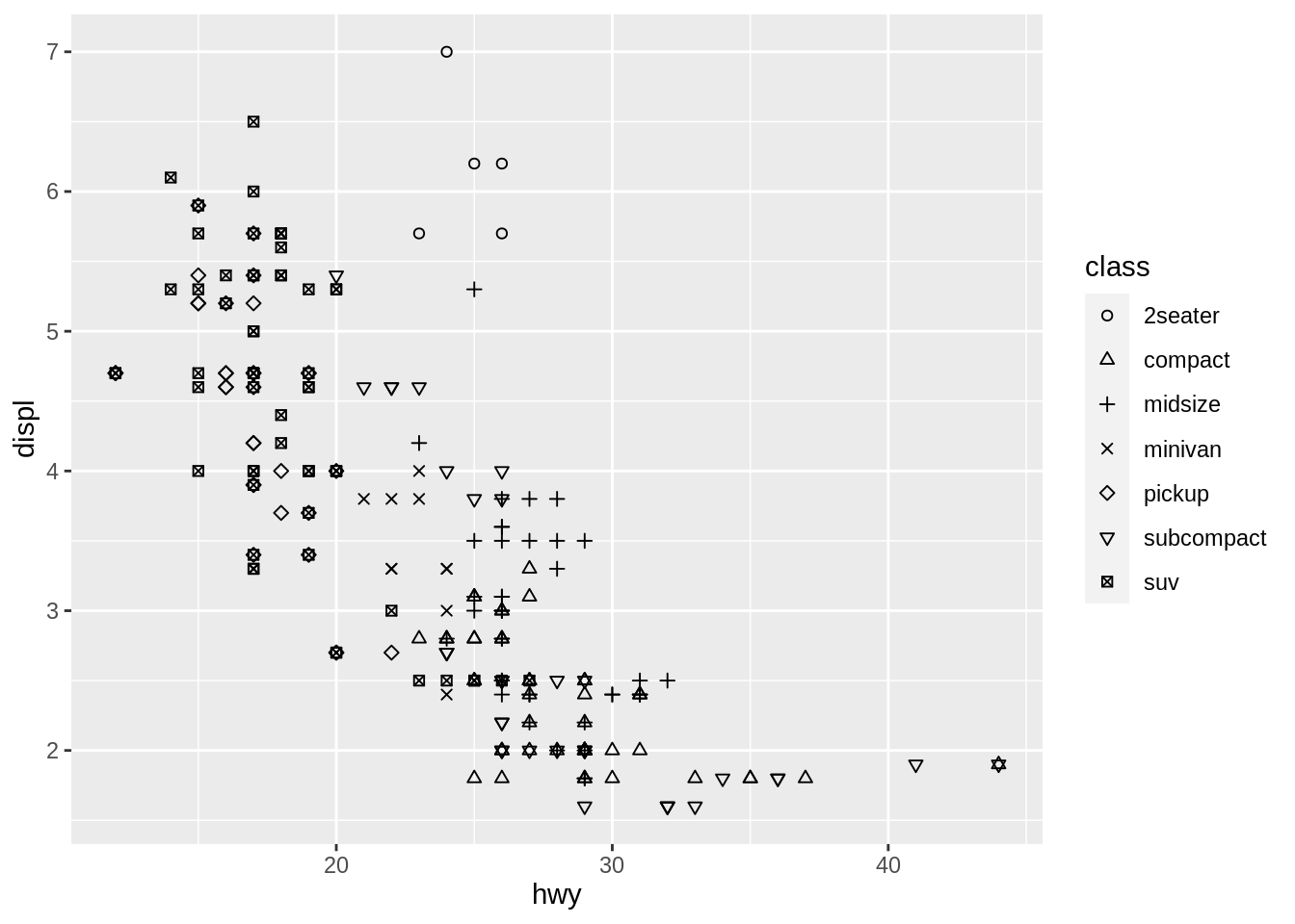 There are two caveats to be made to this rule, however. For instance, if we go back to our original scatter plot and change which shapes we’re using: