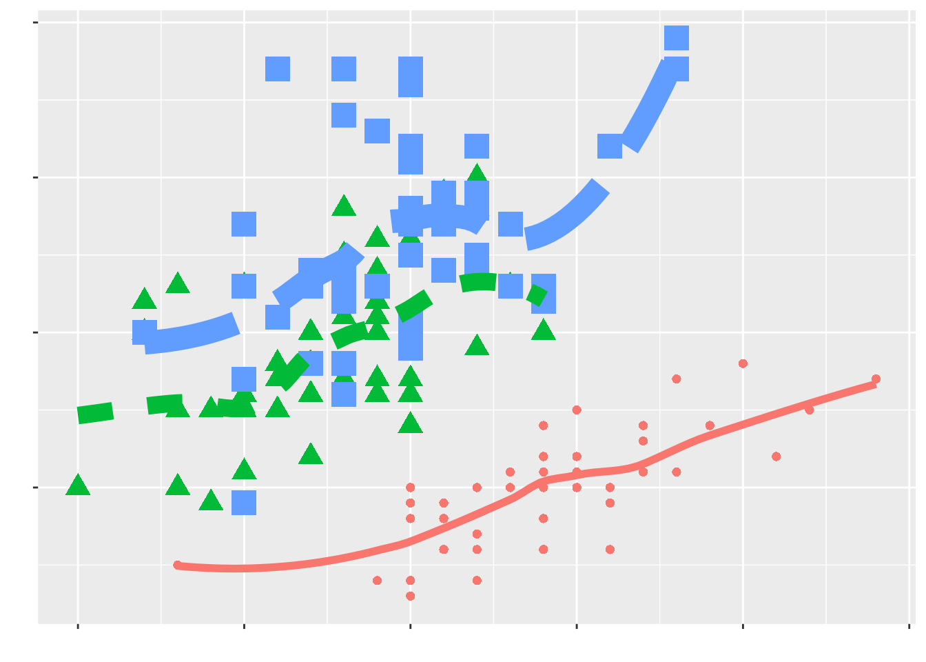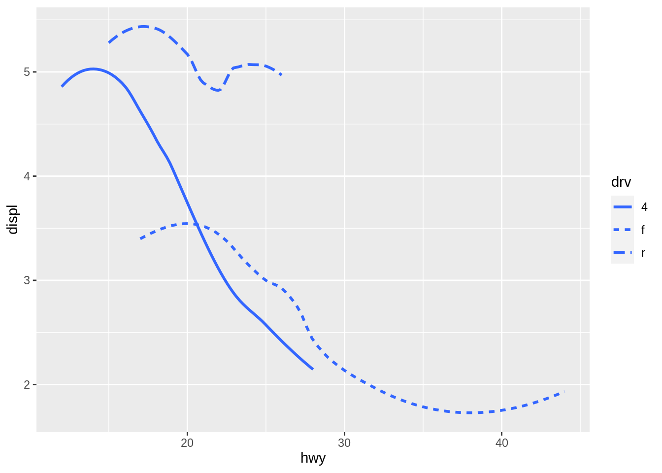 The same basic concepts apply when we change the shape of lines, not just points. For instance, if we plot separate trendlines for front-wheel, rear-wheel, and four-wheel drive cars, we can use linetype to represent each type of vehicle: