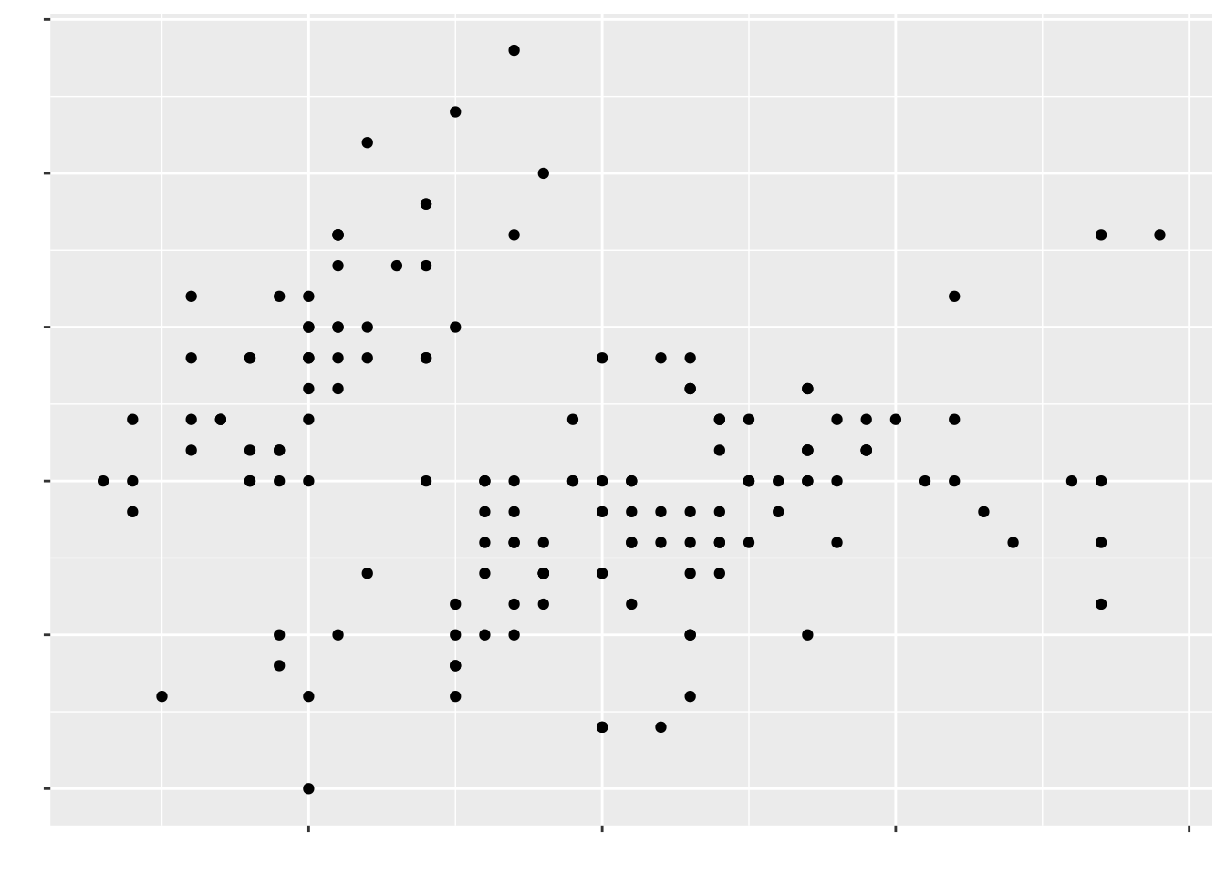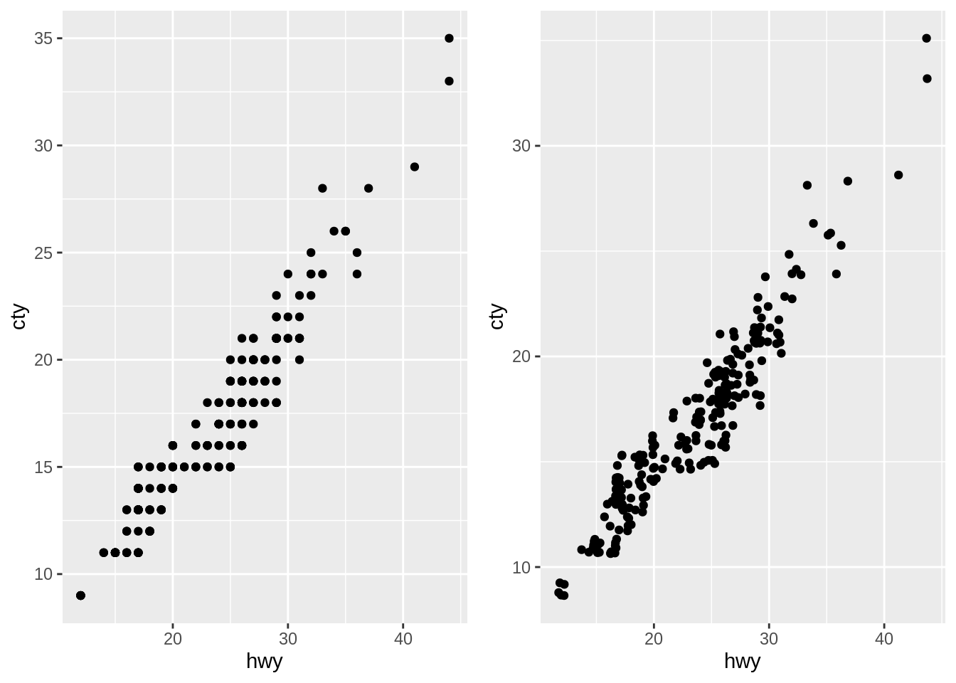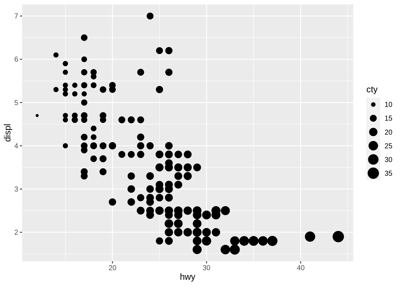 In this example, the points representing a cty value of 10 don’t look anything close to 1/3 as large as the points representing 30. This makes the increase seem much steeper upon looking at this chart – so be careful when working with size as an aesthetic that your software is using the area of points, not radius!