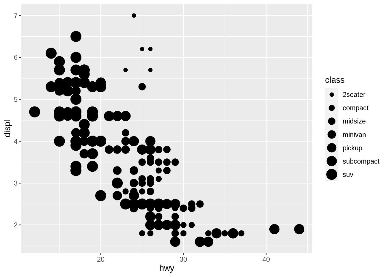 It’s also worth noting that unlike color – which can be used to distinguish groupings, as well as represent an ordered value – it’s generally a bad idea to use size for a categorical variable. For instance, if we mapped point size to class of vehicle: