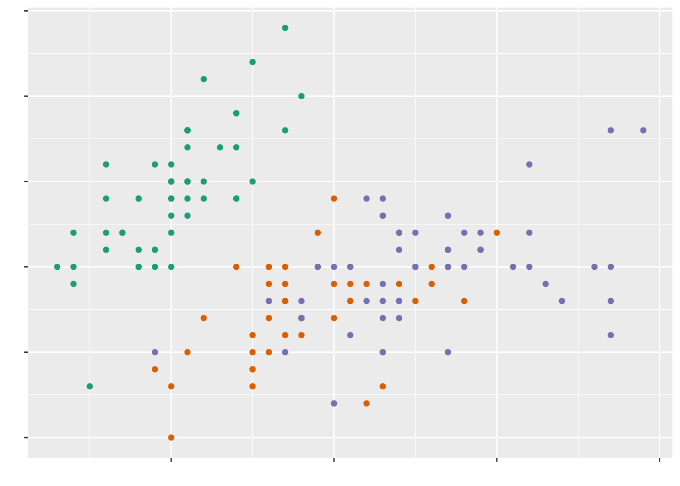 The easiest aesthetic to pair color with is the next most frequently used – shape. This one is much more intuitive than color – to demonstrate, let’s go back to our scatter plot: