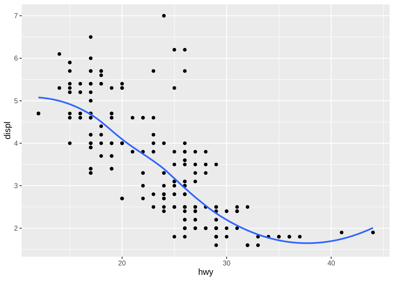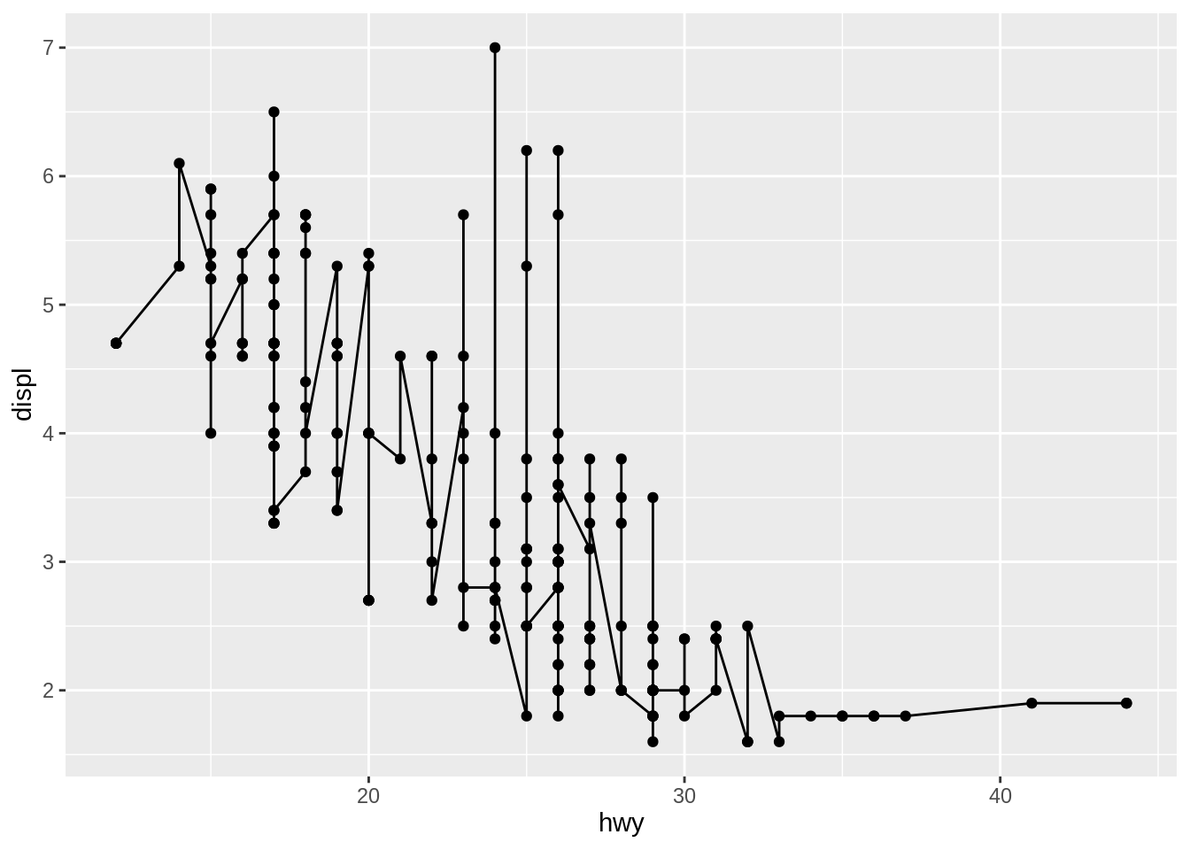This chart uses two geoms that are really good for graphs that have a continuous y and a continuous x - points and lines. This is what people refer to most of the time when they say a line graph - a single smooth trendline that shows a pattern in the data. However, a line graph can also mean a chart where each point is connected in turn: