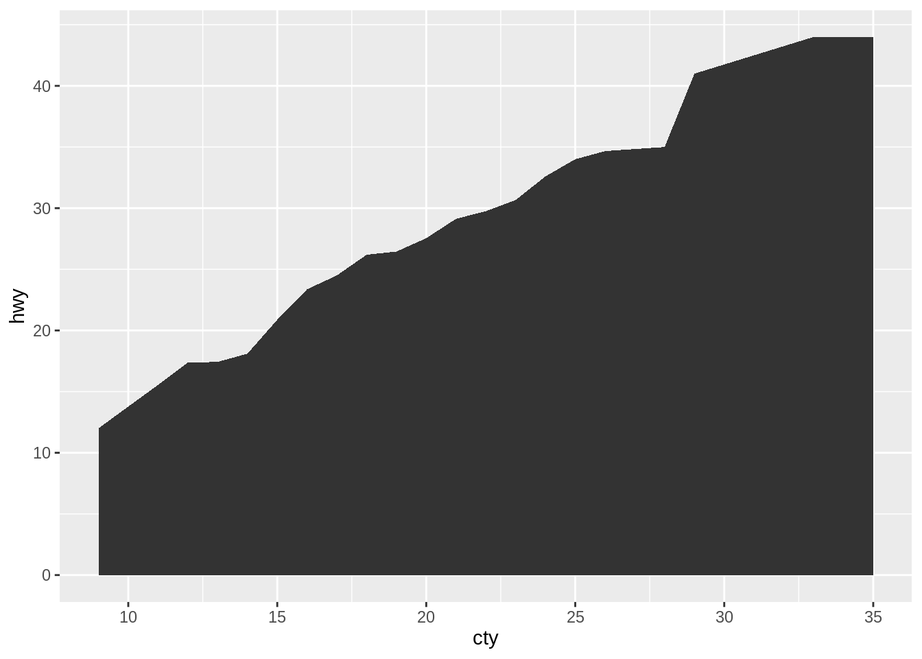 One last chart that does well with two continuous variables is the area chart, which resembles a line chart but fills in the area beneath the line: