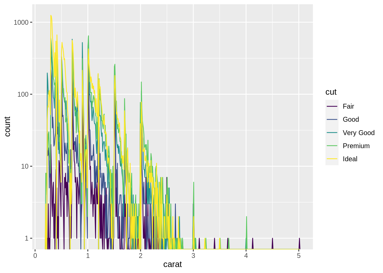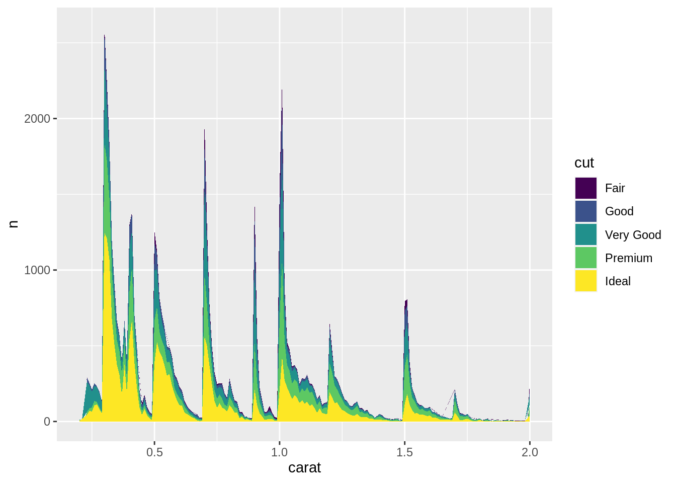 Now one drawback of stacked area charts is that it can be very hard to estimate how any individual grouping shifts along the x axis, due to the cumulative effects of all the groups underneath them. For instance, there are actually fewer “fair” diamonds at 0.25 carats than at 1.0 – but because “ideal” and “premium” spike so much, your audience might draw the wrong conclusions. In situations where the total matters more than the groupings, this is alright – but otherwise, it’s worth looking at other types of charts as a result.