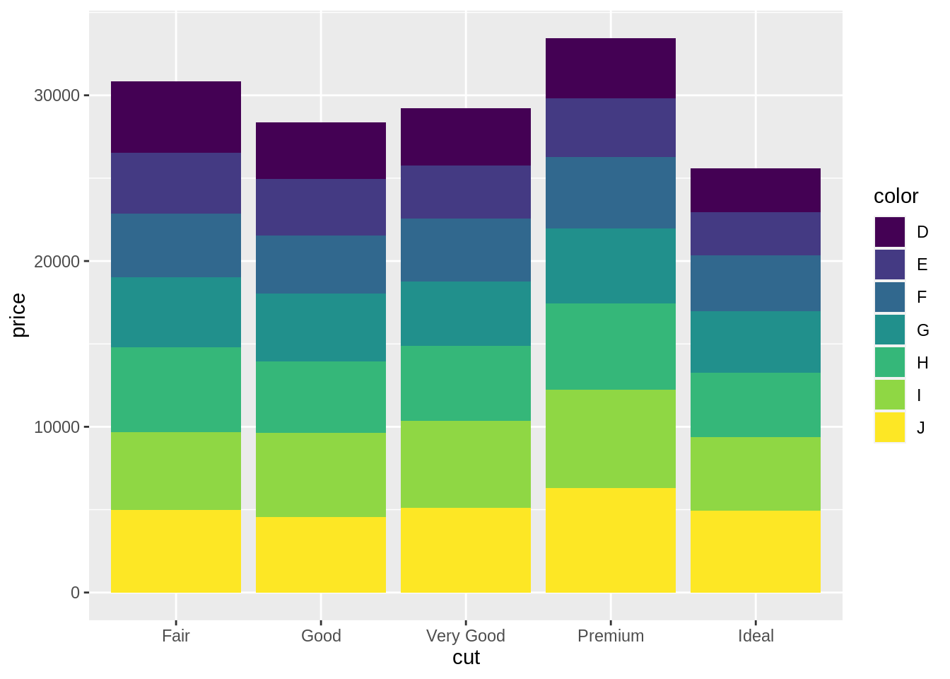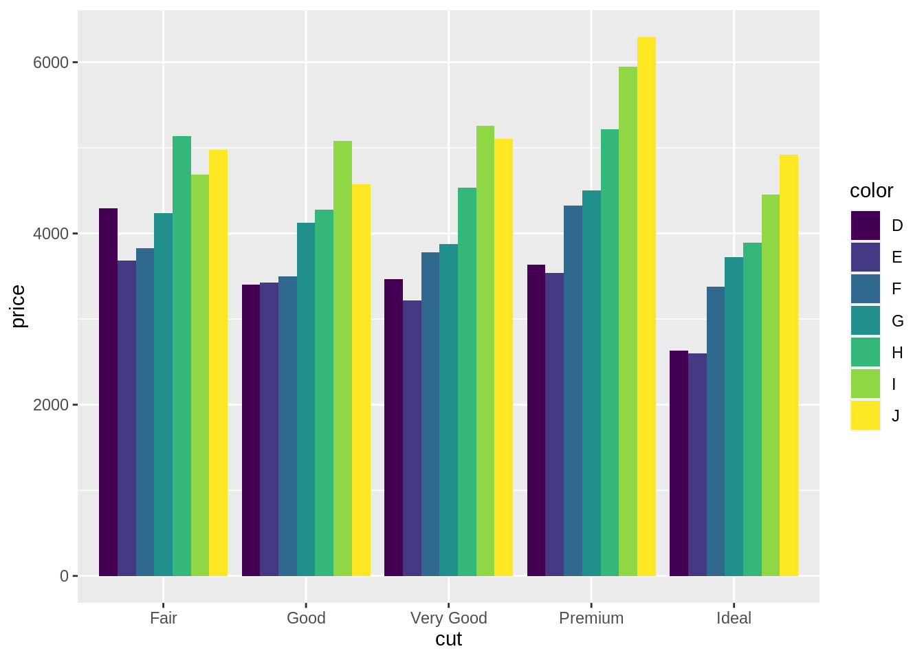 Compare Fair/G to Premium/G. It’s next to impossible to accurately compare the boxes – they don’t share a top or a bottom line, so you can’t really make a comparison. In these situations, it’s a better idea to use a dodged bar chart instead: