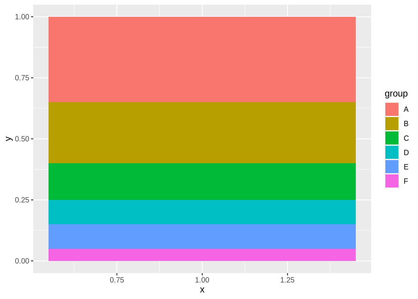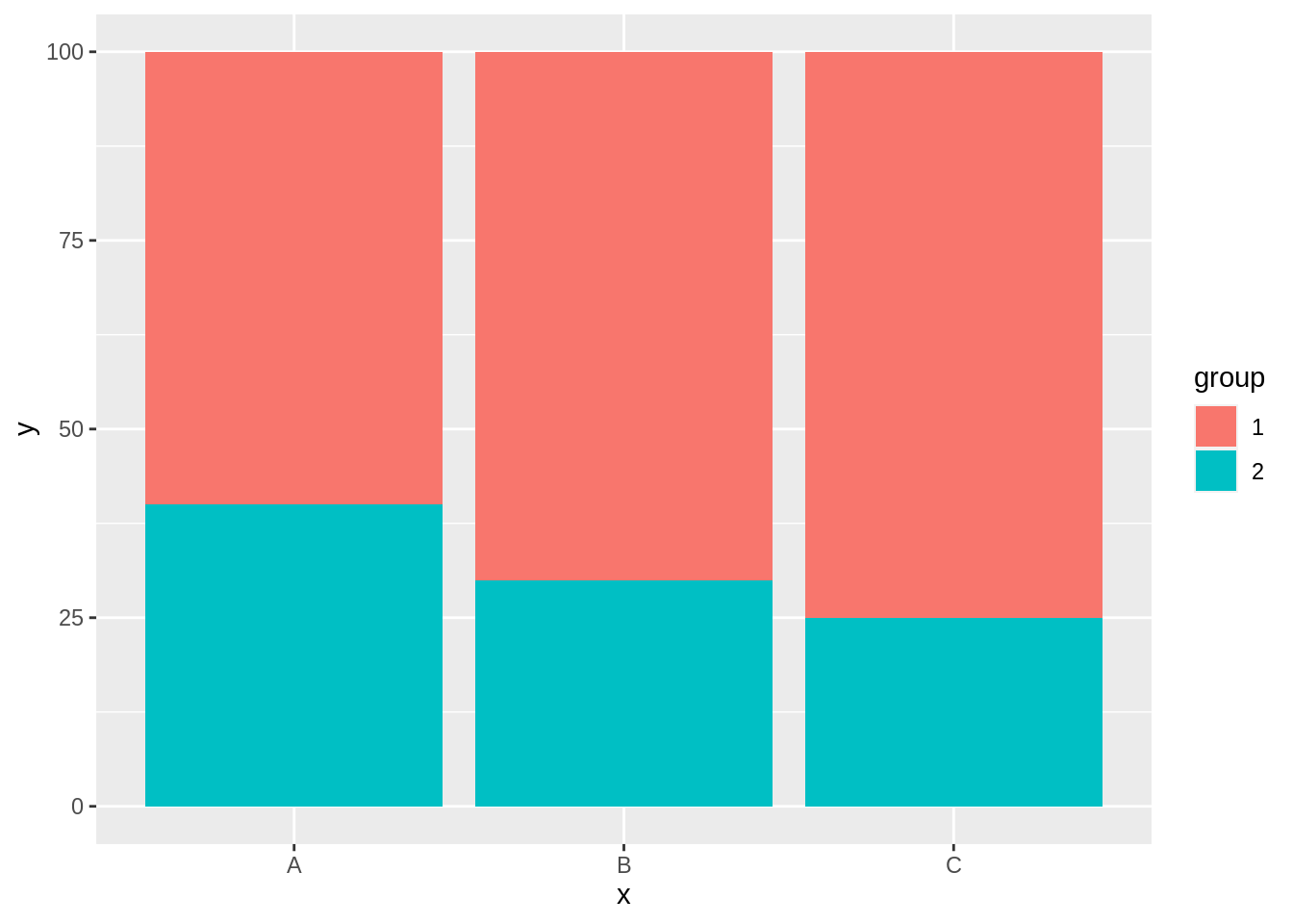 In this case, making comparisons across groups is trivial, made simple by the fact that the groupings all share a common line - at 100% for group 1, and at 0% for group 2. This point of reference solves the issue we had with more than two groupings – though note we’d still prefer a dodged bar chart if the bars didn’t always sum to the same amount.