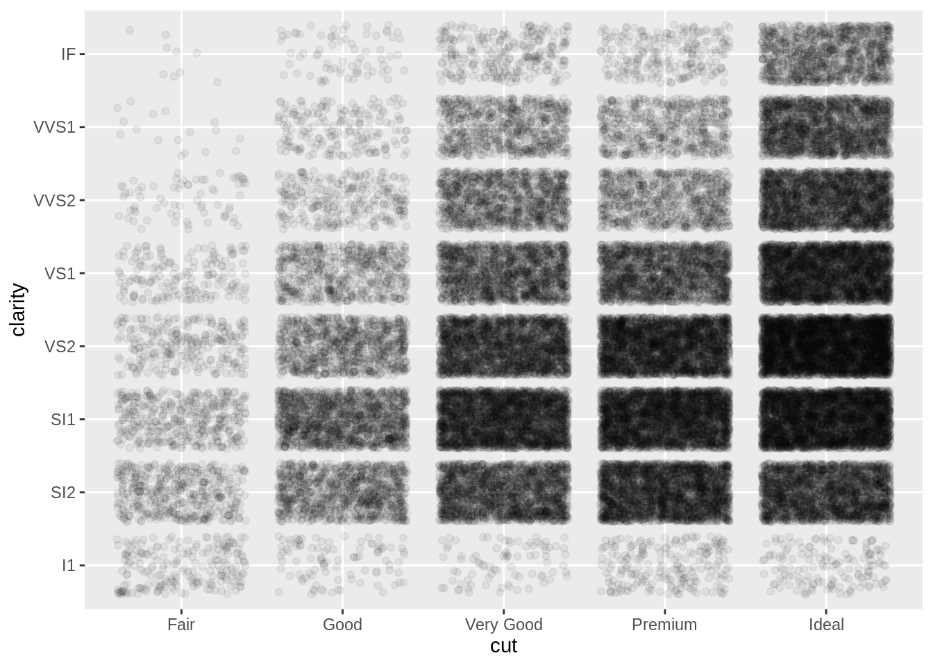 One method is to use density, as we would in a scatter plot, to show how many datapoints you have falling into each combination of categories graphed. You can do this by making a “point cloud” chart, where more dense clouds represent more common combinations: